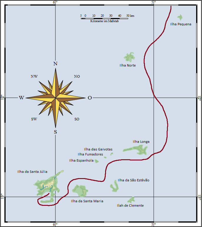 Eine halbe Stunde waren sie schon an der Südküste lang gefahren, da kam eine weitere Insel in Sicht. Jorge änderte den Kurs auf Nordost um nördlich dieser Insel vorbei zu fahren. Das muss die Insel sein, die der Erkundungstrupp beschrieben hat. Zu Ehren der Jungfrau Maria gab er ihr den Namen – Ilha da Santa Maria. Viele Monate später wird der oberste Kartograph des portugiesischen Königs mal wieder mit dem Kopf schütteln, über so viel Einfallslosigkeit der portugiesischen Entdecker.