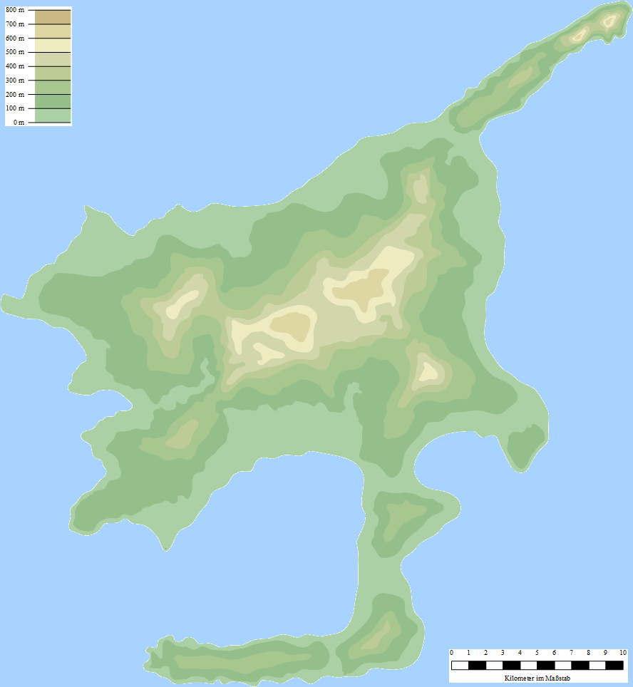 Die eigenwillige Form der Insel geht auf vulkanische Tätigkeit vor rund 100.000 Jahren zurück. Die große Bucht von über 10 km Durchmesser im Süden der Insel ist die, inzwischen mit Meerwasser gefüllte Caldera des Vulkans.